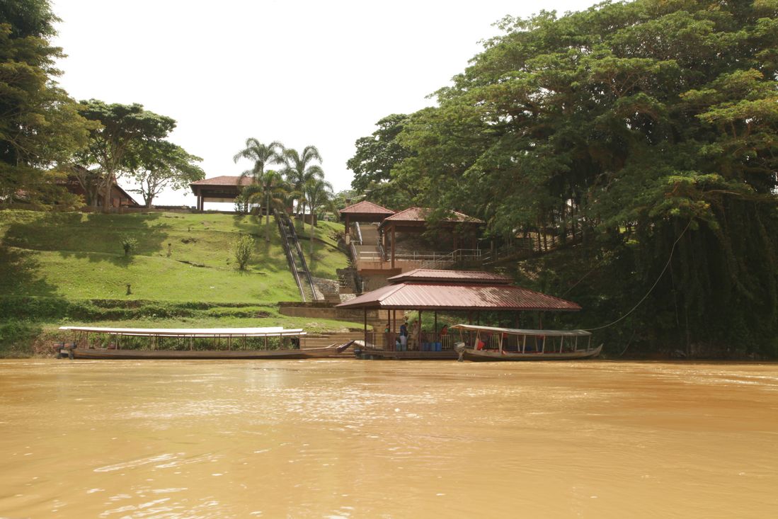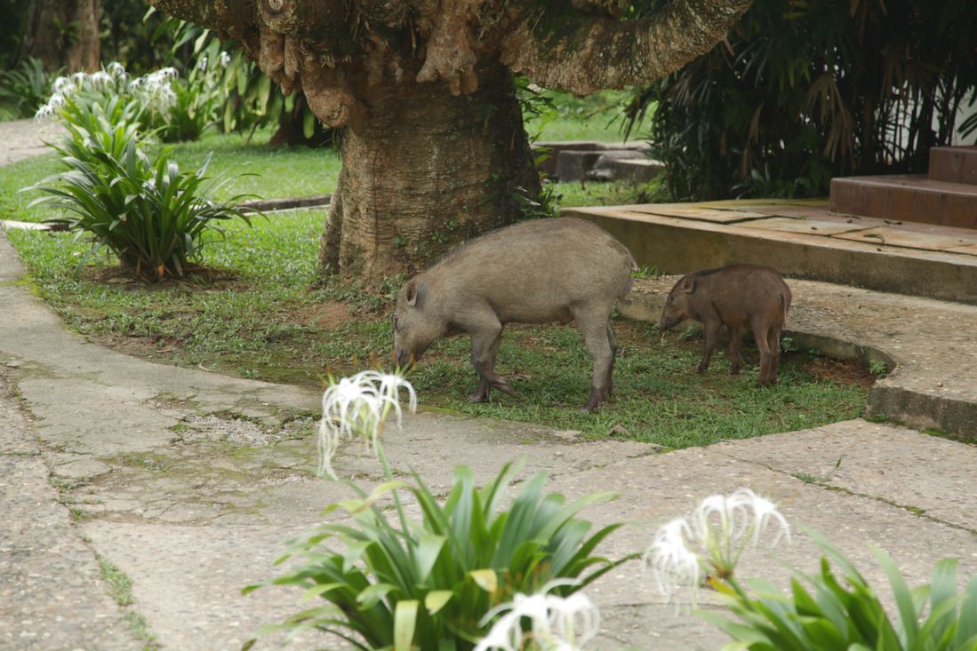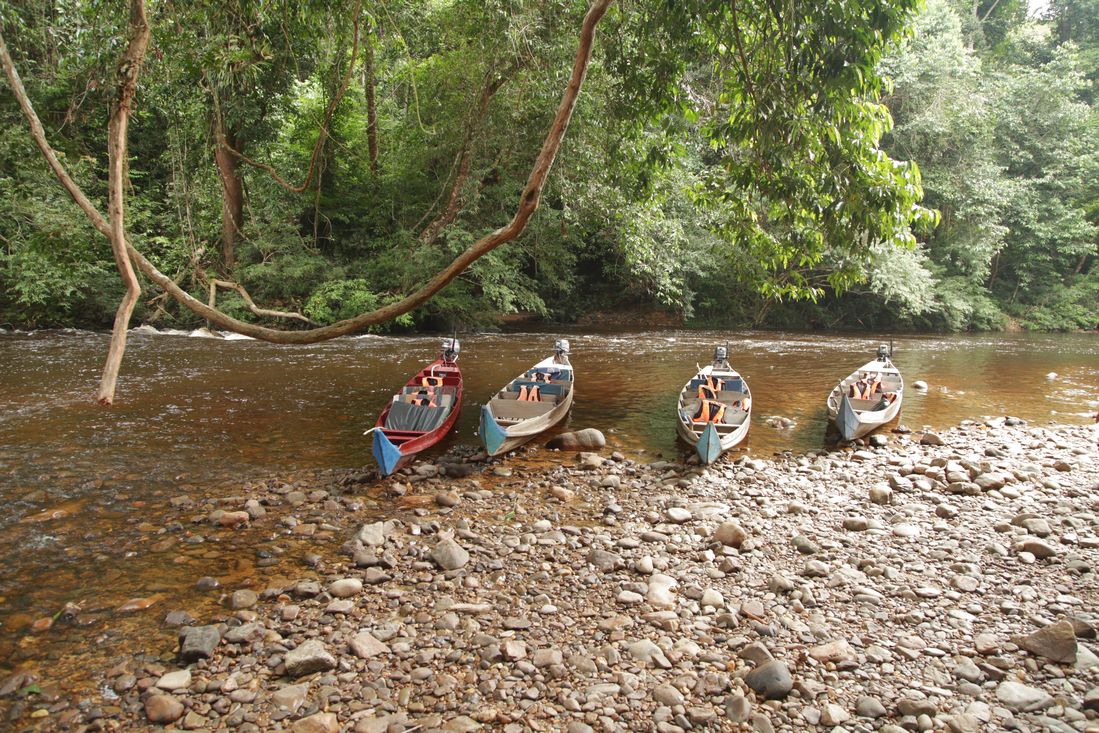 We konden nog niet vertrekken, want er moest nog gewacht worden op nog een aantal gasten voor Mutiara Taman Negara. Maar om een uur of een was het dan zover. Wel even de koffers de trappen afslepen, want het hiervoor bedoelde railsysteem was natuurlijk alweer jaren defect. We mochten plaatsnemen in een lange, smalle houten boot en ook de koffers vonden nog een plekje. Na het omdoen van de reddingvesten werd de motor gestart. Ruim twee uur later bereikten we het resort. Het karretje-op-rail deed het hier gelukkig wel. Na een allerhartelijk ontvangst kregen we de sleutel van onze huisjes en werden even later de koffers bezorgd. Even opfrissen en snel een bierje scoren op het terras. O, dat is lekker, ze hebben ook kleine sataytjes. Mmmmm. Hanneke, Louk en Agnes zijn nog even aan de overkant gaan kijken en ik moest heel even de vele indrukken verwerken. En dat gaat het beste als ik er even bij ga liggen. 's-Avonds hebben we heerlijk gegeten in het restaurant op het resort. Het diner werd nog even verstoord door een tapir, die op bezoek kwam.