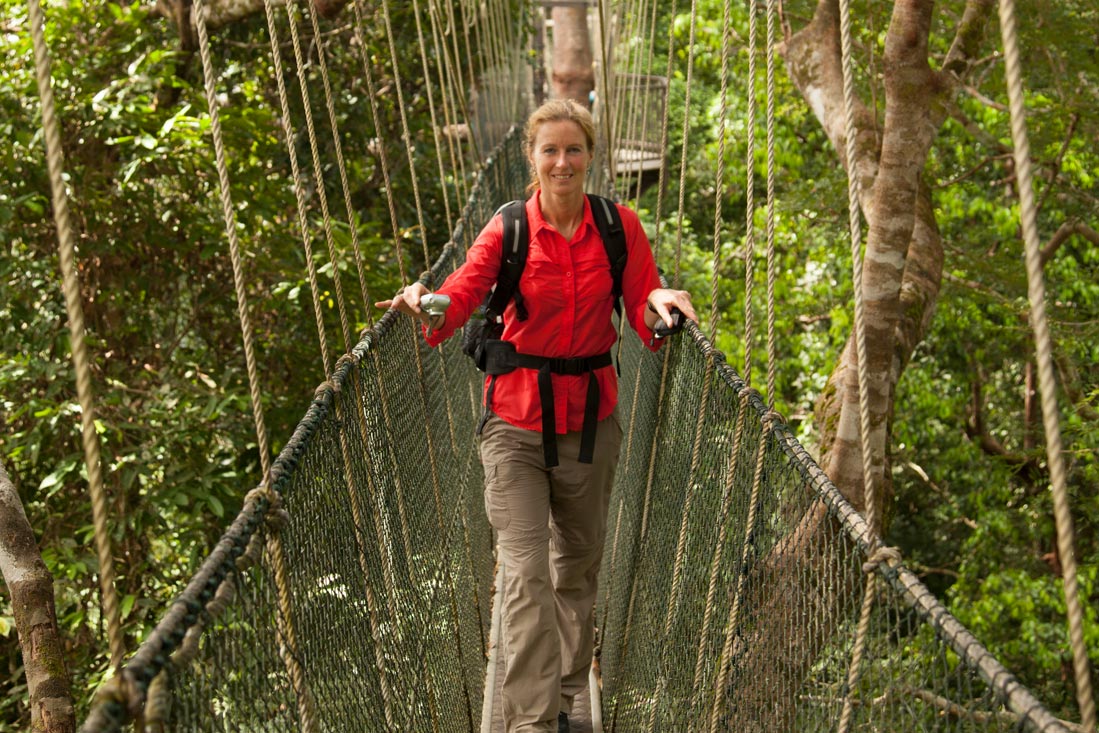 De volgende dag hadden we een jungletour mƩt gids afgesproken. Na het ontbijt vertrokken we met een kleine groep de jungle in. De gids stopte regelmatig om van alles uit te leggen over de vruchten, bomen, beesten enz. enz. Na een flinke klim kwamen we terecht op een uitzichtpunt, waar eigenlijk -behalve bomen- niets te zien was. Dus net zo hard weer naar beneden en op naar de Canopy Walk. Deze touwbruggen hangen op zo'n 40 M. hoogte in de bomen en daar zag ik nogal tegenop. Maar tot m'n grote verbazing leek de hoogtevrees even uitgeschakeld en wandelde ik net als de rest, fluitend over de smalle plankjes.