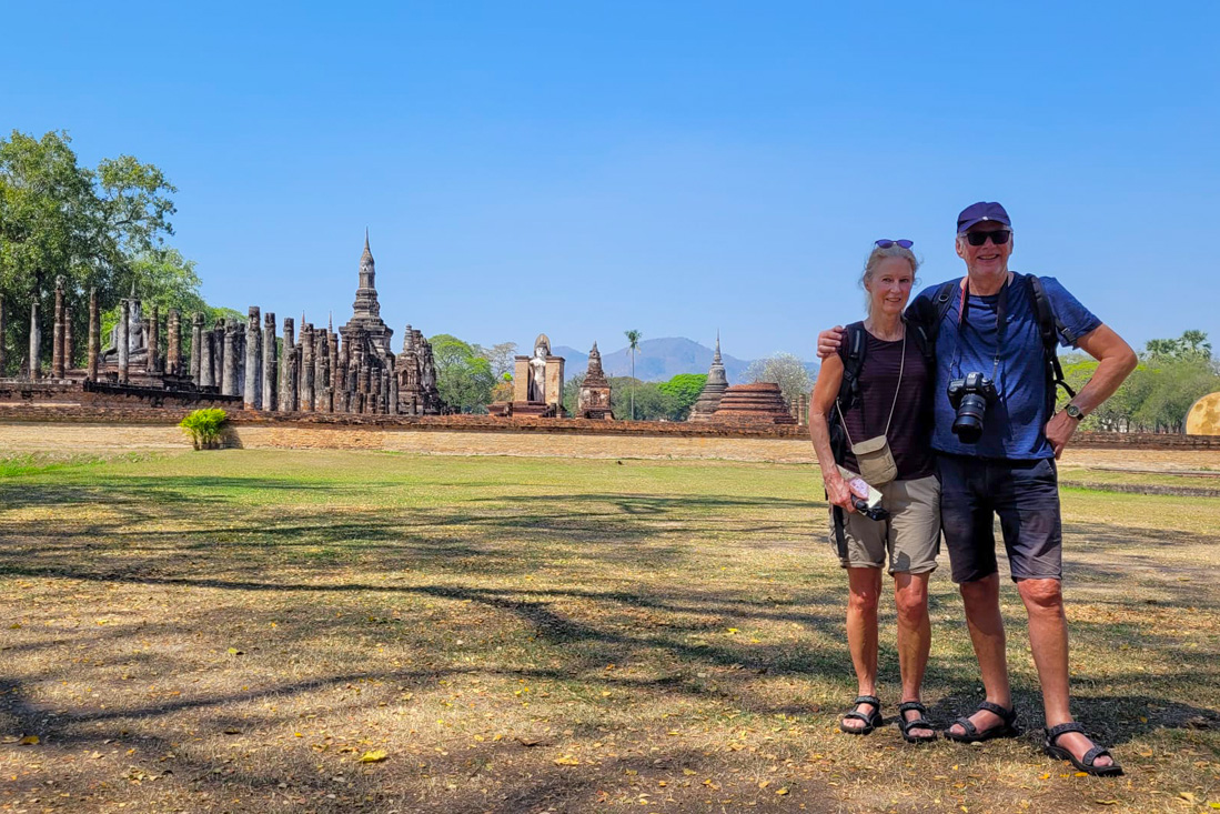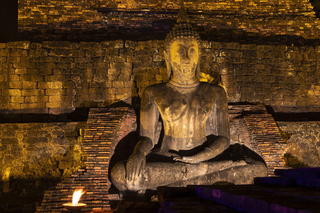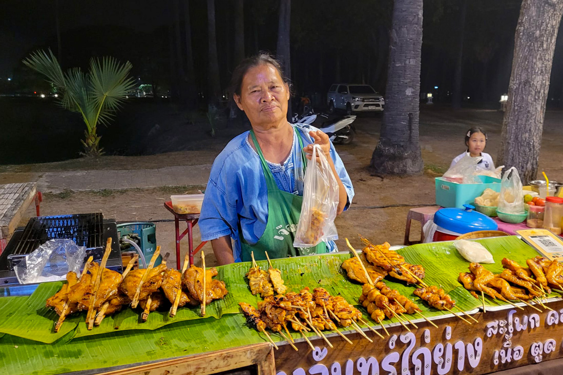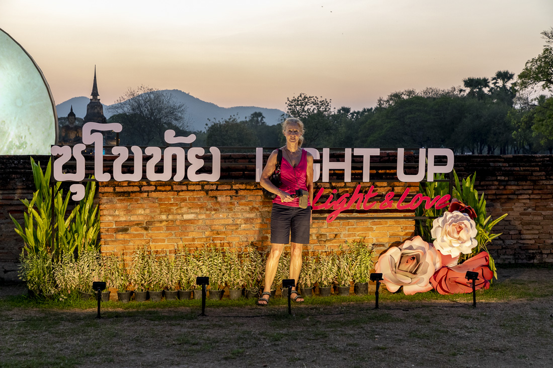 Lekker laat en lang ontbeten en toen op onze veel te kleine huurfietsen gestapt voor een ronde over het Sukothai Historical Park. Op de weg naar het park nog even bij de fietsverhuurder geïnformeerd naar een hoger model. Als oplossing trok hij de zadelpen er zo'n 10 cm verder uit. Tja... Na het kopen van de tickets mochten we met de fiets naar binnen. Dat bleek een goede keuze, want het terrein was enorm groot en de tempels stonden over het hele park verspreid. Dus veel fietsen. Van een Amerikaanse toerist hoorden we dat het hele park vandaag voor het laatst volledig verlicht zou zijn en dat deze lichtshow een must was. Dus na de lunch en het zwembad opnieuw op de fiets gestapt en opnieuw het park ingefietst. De aangekondigde Thaise dansshow ging blijkbaar niet door. Tijdens het wachten ons tegoed gedaan aan de satehtjes van één van de vele stalletjes. Terwijl het langzaam donker wordt, gaat de verlichting van het park aan. Dat was écht een (verjaardags)cadeautje.