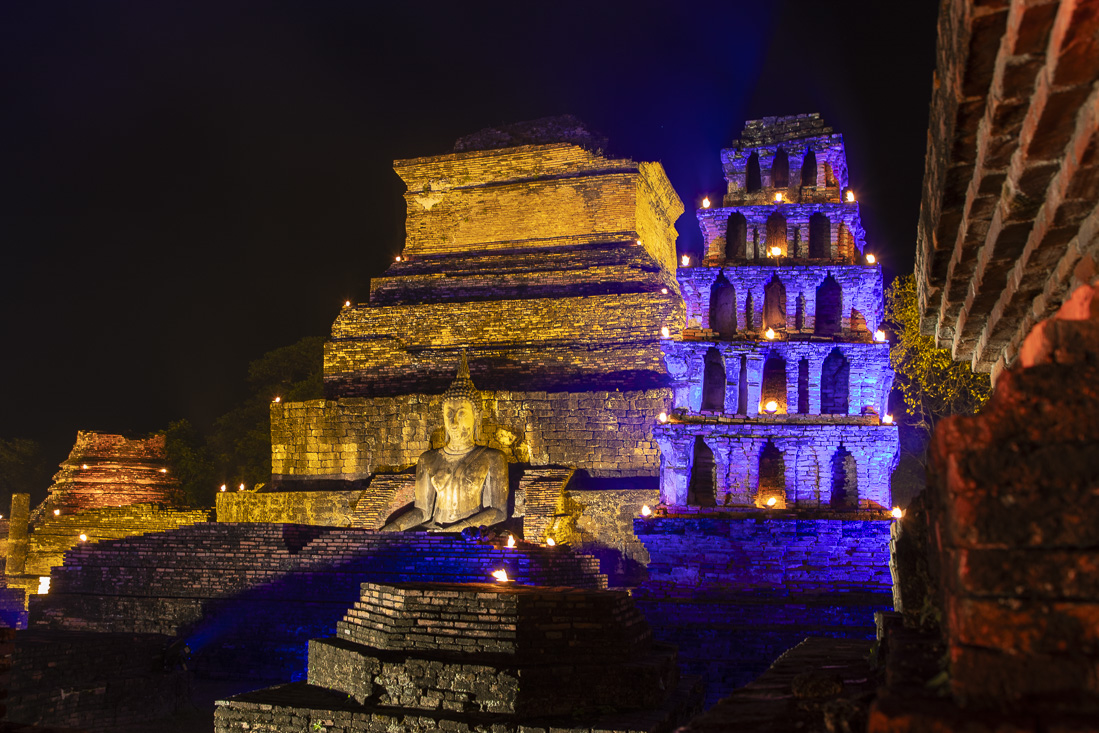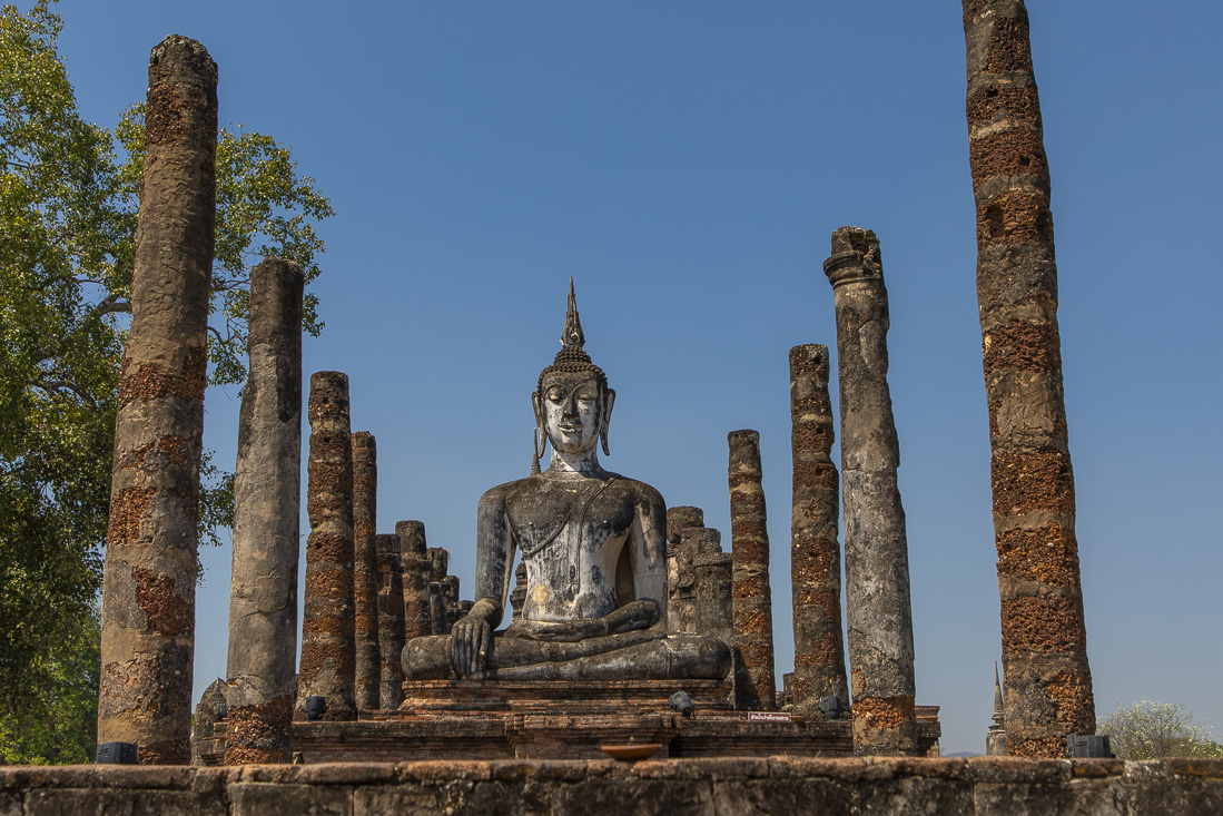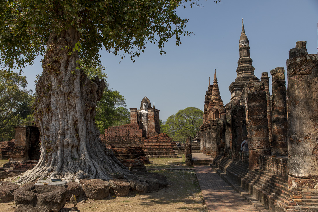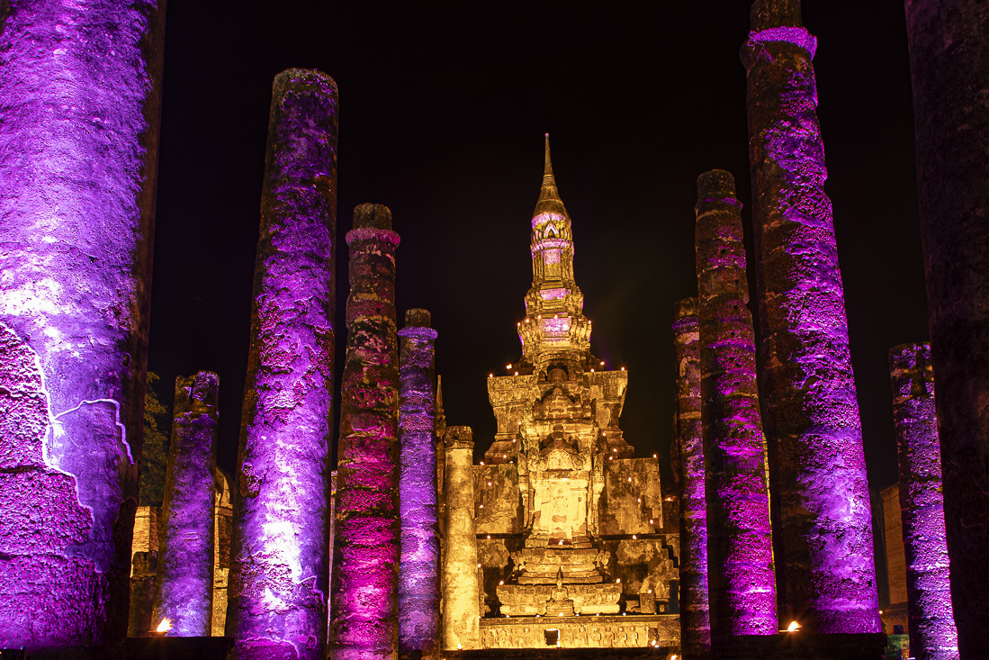Lekker laat en lang ontbeten en toen op onze veel te kleine huurfietsen gestapt voor een ronde over het Sukothai Historical Park. Op de weg naar het park nog even bij de fietsverhuurder geïnformeerd naar een hoger model. Als oplossing trok hij de zadelpen er zo'n 10 cm verder uit. Tja... Na het kopen van de tickets mochten we met de fiets naar binnen. Dat bleek een goede keuze, want het terrein was enorm groot en de tempels stonden over het hele park verspreid. Dus veel fietsen. Van een Amerikaanse toerist hoorden we dat het hele park vandaag voor het laatst volledig verlicht zou zijn en dat deze lichtshow een must was. Dus na de lunch en het zwembad opnieuw op de fiets gestapt en opnieuw het park ingefietst. De aangekondigde Thaise dansshow ging blijkbaar niet door. Tijdens het wachten ons tegoed gedaan aan de satehtjes van één van de vele stalletjes. Terwijl het langzaam donker wordt, gaat de verlichting van het park aan. Dat was écht een (verjaardags)cadeautje.