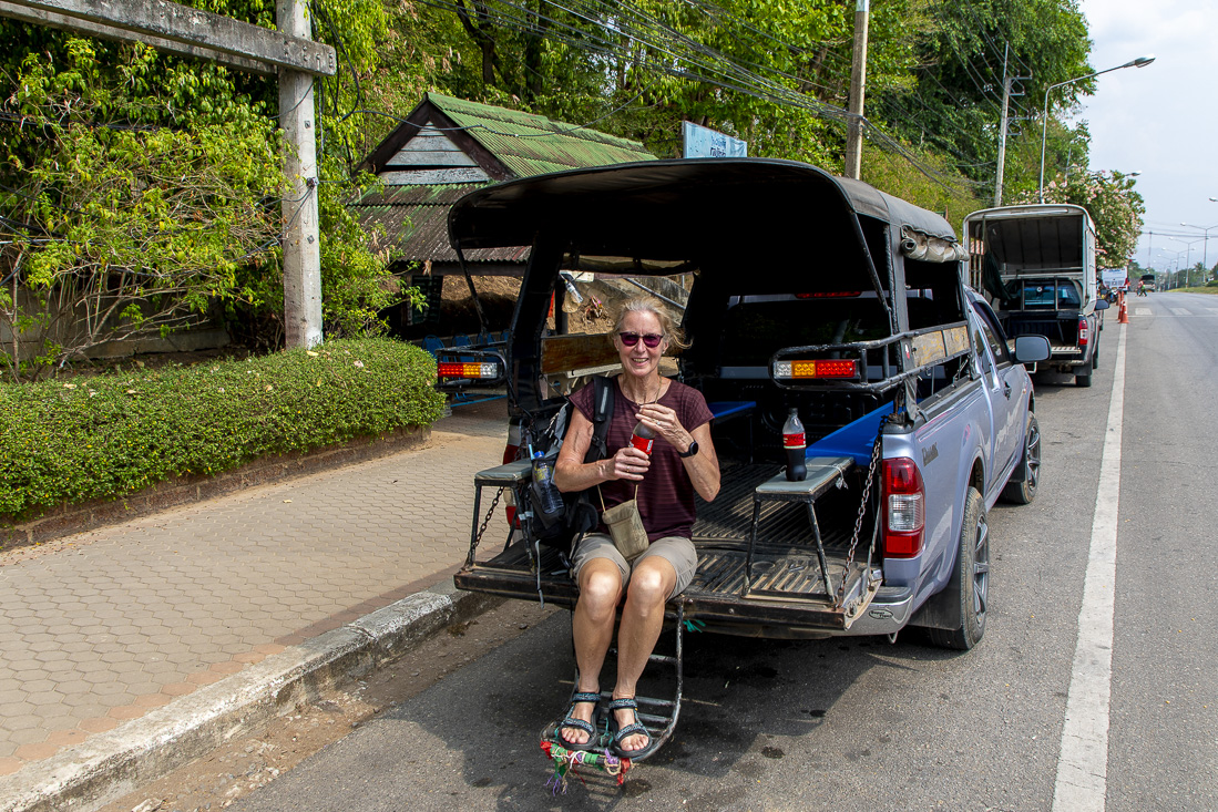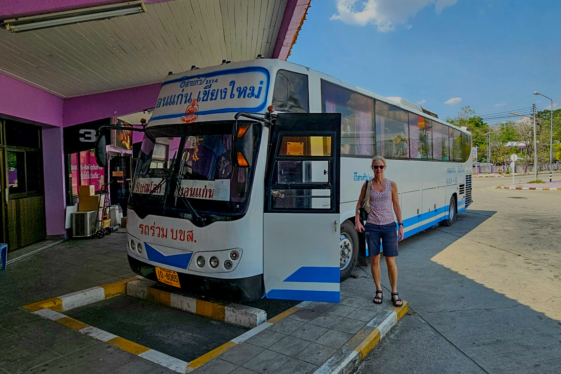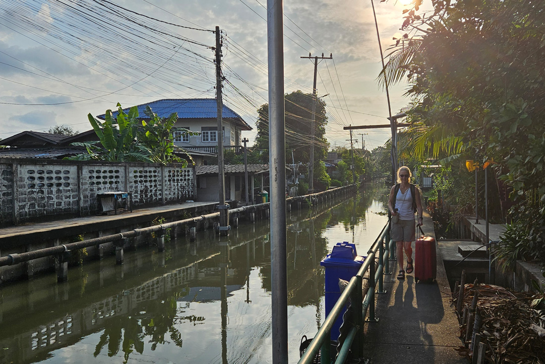 Om 9.00u zou er een TukTuk klaar staan om ons naar de busterminal in Sukothai te brengen. Voor het luttele bedrag van Tb 200 25 minuten knetteren. Op het busstation konden we ook nog even afscheid nemen van onze Duitse buren uit Heidelberg. Zij namen vandaag de bus naar Ayutthaya en wij naar Bangkok. De plekken in de bus bleken zeer ruim te zijn en dat was wel lekker als je zo'n 7 uur moet zitten. Onderweg kregen we nog een lunch aangeboden bij zo'n typisch Thais wegrestaurant. Tegen 18.00uur stopten we een enorme busterminal in Bangkok. Op loopafstand van het Krung Thap Aphiwat station, dachten we. Afstanden schatten in Bangkok bleek niet onze sterkste kant. Gelukkig bleek er een shuttebus te rijden en dit zette ons een kwartiertje later af bij het station. Snel naar de bovenverdieping om de metro naar Taling Chan te nemen. Bij het station bestelden we een grab om ons naar de homestay te brengen. In de taxi was het een graadje of -20. Het vinden van onze geboekte homestay bleek niet mee te vallen. Het was inmiddels pikkedonker en de ingang van ons verblijf bleek zich in een wijkje met onverharde Ʃn overlichte wegen te bevinden. De homestay zelf was een soort oase in de chaos er omheen. Maar ja, we moesten ook nog wat eten. De eigenaresse legde uit dat je via de achteruitgang langs het water ook naar de weg kon komen. Dat gedaan en daar maar een grab besteld en ons naar een Indiaas restaurant later brengen.