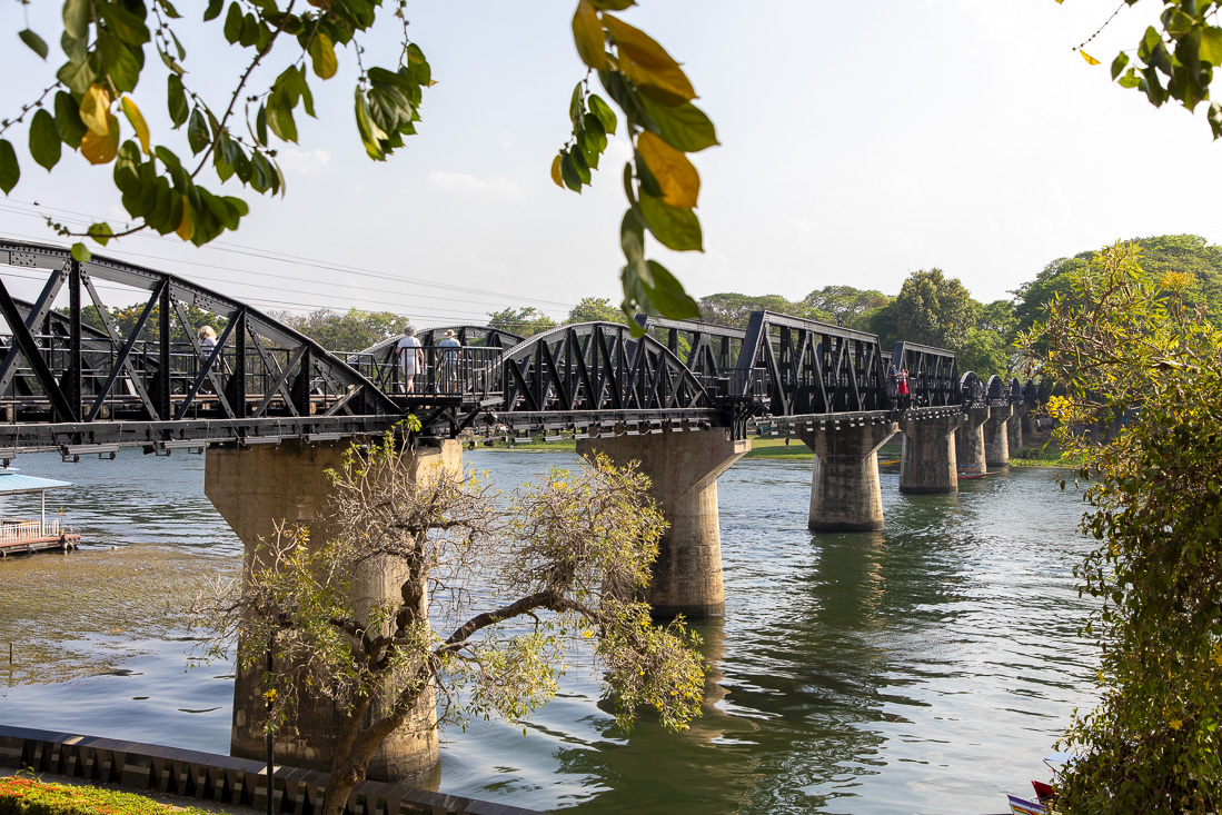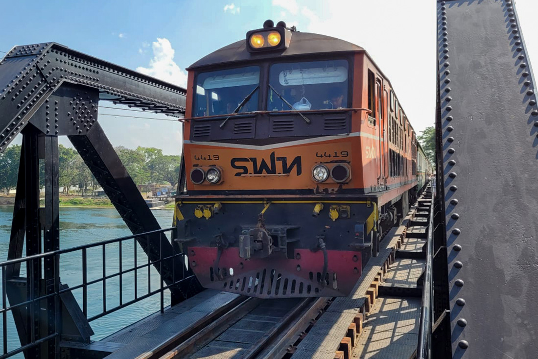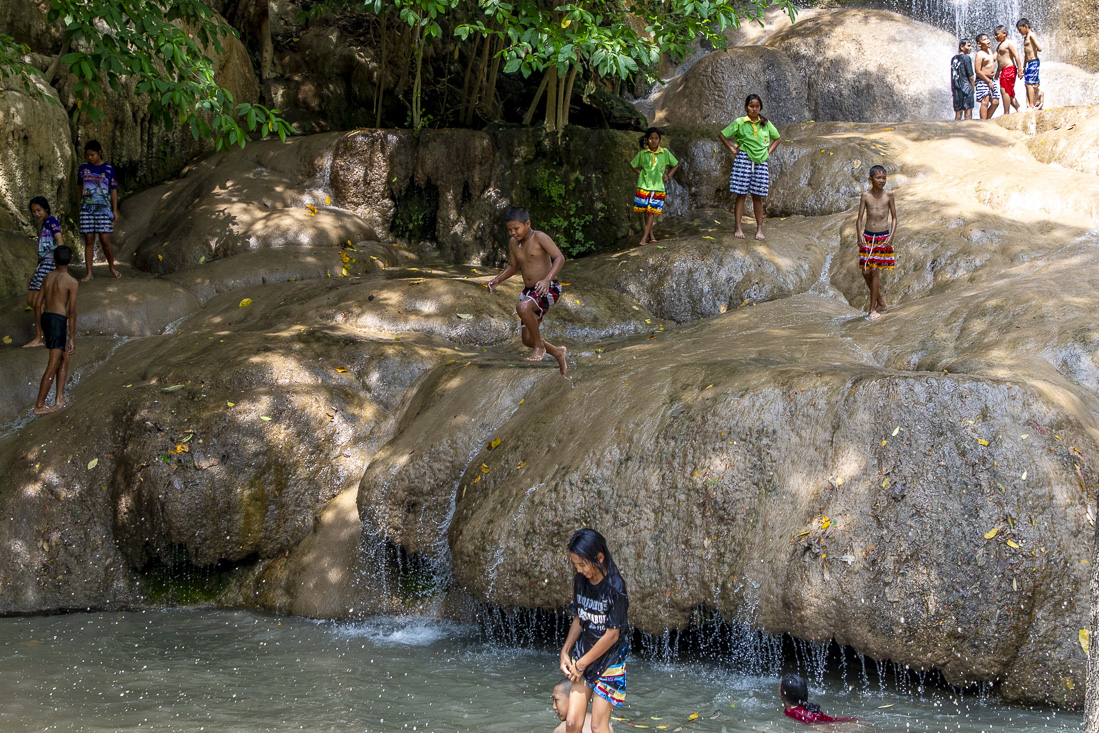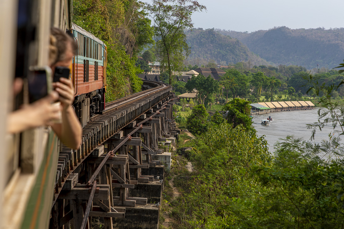 Als je dan toch in Kanchanaburi bent, dan moet je natuurlijk ook met de trein over de Death Railway. Dus namen we een grab naar het station en konden na de aanschaf van de kaartjes wachten op de trein. Paar minuten later stoppen er twee bussen met schoolkinderen, die blijkbaar ook met de trein naar Nam Tok zouden reizen. Nog iets later komt de trein met veel lawaai het station binnen denderen. De trein stond nog niet stil, of iedereen stoof naar binnen voor het beste plekje aan een (linker)raam. Na 10 minuten reden we stapvoets over de bekende brug en twee uur later arriveerden in Nam Tok. Bij het station eerst maar eens een grote ijskoffie gedronken en wat kleins gegeten. Na een wandeling door het nietszeggende dorpje ons door een songtheaw naar de Sai Yok Noi Waterfall laten vervoeren. We moesten ons bij een loketje aanmelden met naam, geb.dd Ʃn telefoonnummer en mochten daarna doorlopen. Toen we in de buurt van de waterval kwamen wisten we ook meteen waar de 2 bussen met schoolkinderen naar toe gingen. Hier dus. Het was een kabaal van jewelste. Ondanks het lage water konden de vele kinderen zich uitstekend vermaken en wij daardoor ook. De songtheaw had op ons gewacht en bracht ons voor eenzelfde bedrag ook weer terug naar het station. De trein van 15.30u was zo goed als leeg, dus alle plekjes aan de (rechterramen) waren zo goed als leeg. Na opnieuw een prachtige treinreis kwamen reden we om 17.30u Kanchanaburi weer binnen. Snel naar het zwembad.