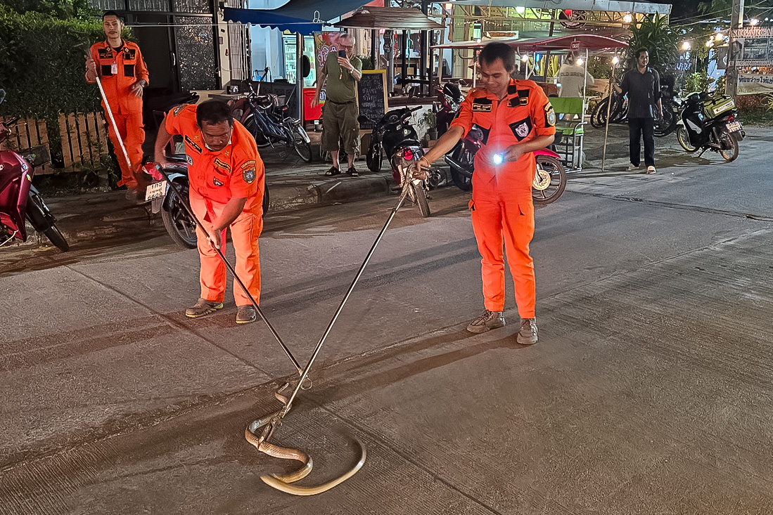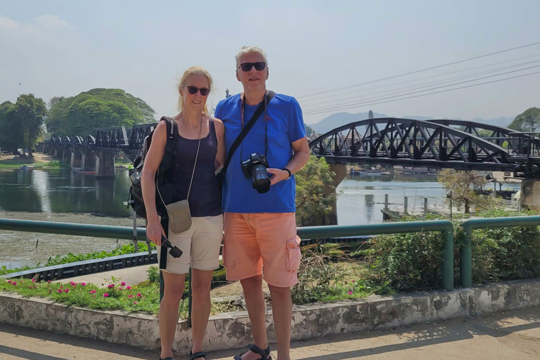 We stonden al om kwart voor zeven naast ons bed. Eerst via de handige achteruitgang naar de weg gewandeld en toen 20 minuutjes naar de busterminal zuid. Na het tonen van onze instapkaart mochten de koffers alvast in de bus en konden wij op zoek naar een ontbijtje. Ook hier een cafƩ Amazon, maar geen sandwiches. Gelukkig wel een 7-Eleven met broodjes. Iets voor 9.00u vertrok onze bus naar Kanchanaburi, waar we om uur of half 12 aankwamen. Met de grab naar het hotel en na een snelle afkoelronde op de werkelijk zeer beroerde fietsen naar de bekende brug over de River Kwai gefietst. Na een tijdje op de trein gewacht te hebben op een naburig terrasje wat gegeten. We zitten nƩt toen we trein op afstand hoorden aankomen. Agnes rende met de GoPro snel naar de brug. Bij het zwembad maar eens bijgekomen van de indrukken en de busreis. 's Avonds naar Meals n' Bites gewandeld om wat te eten. De iets later gearriveerde ambulance hadden we wel opgemerkt, maar verder niet op gelet. Tot we ineens een hoop gegil horen en 3 mannen in oranje pakken achter een gigantische slang aan zien rennen, die met rasse schreden richting ons terras kwam. Ze kregen hem net op tijd te pakken, dus snel paar foto's gemaakt. Toen ik me omdraaide zat Agnes op een tafel bij het terras van de buren. Mijn avond kon natuurlijk niet meer stuk....