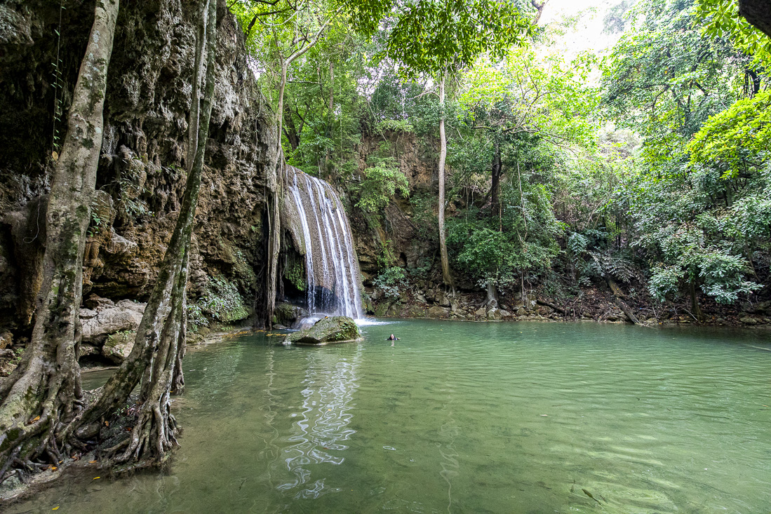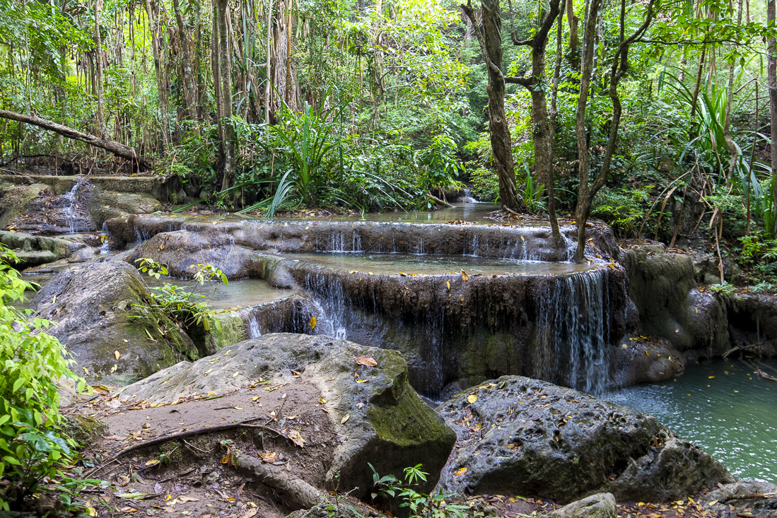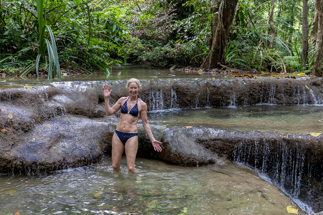 Vandaag stonden de Erawan watervallen op het programma. Volgens de eigenaresse van het hotel zou de bus hier langskomen. Terwijl wij op de bus wachtten, komt zij naar buiten en zwaait naar een blauw gevaar wat in de verte aan komt sukkelen. Onze bus! Alweer zo'n modern exemplaar. Voor een bedrag van Tb 30 worden we naar de watervallen vervoerd. Da's niet duur voor 2 uur schudden. De Erawan watervallen bestaan uit 7 niveaus, waarvoor je steeds hoger moet klimmen en dus verder wandelen. Helaas liet het zonnetje zich vandaag niet zien, wat voor de foto's tussen de bomen niet ideaal bleek te zijn. Aangekomen bij nummer 5 is held Agnes het water in gegaan. We hielden nummer 6 en 7 voor gezien. Tijd om af te zakken. Beneden kochten we nog een ijskoffie en bij een stalletje wat bananen voor de lunch. En toen mochten we weer in de bus. Het blijft een feest. 's Avonds natuurlijk weer naar Meals n' Bites. Daarna de koffers maar weer gepakt.
