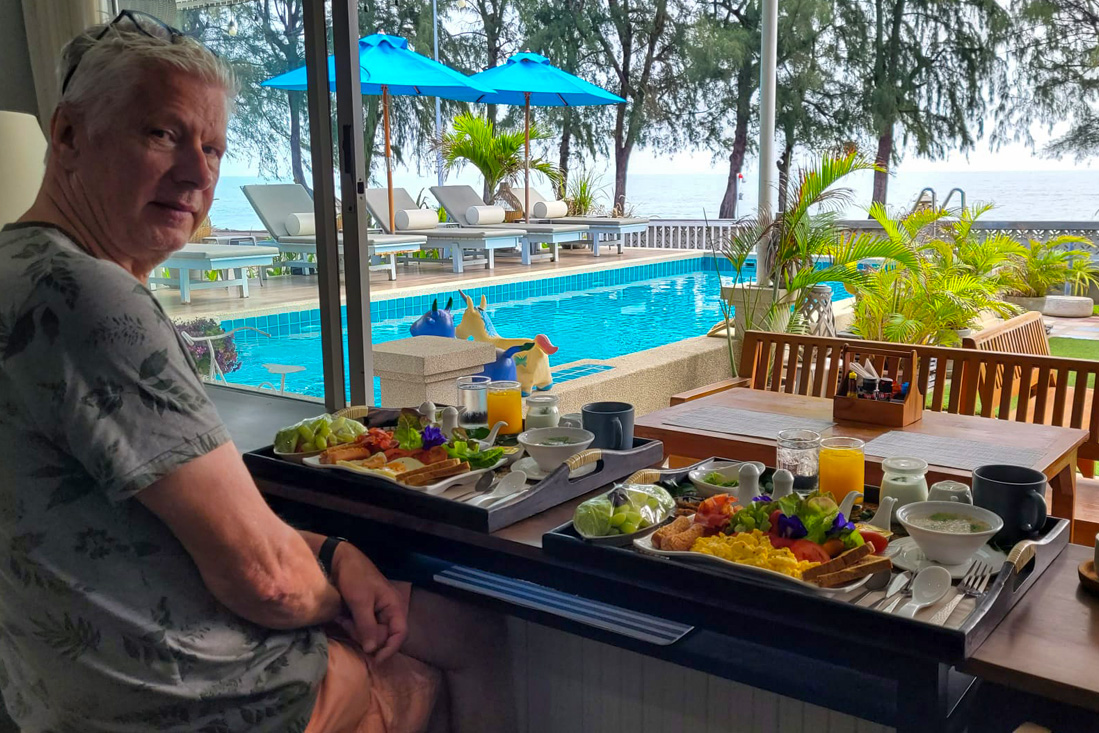 Om 9.00u meldden we ons voor het ontbijt. Manager Ploy had een prachtig plekje voor ons bedacht met uitzicht op zee. Het ontbijt bestond uit een enorm dienblad (per persoon) vol met allerhande lekkers en veel te veel. Gelukkig waren de ligbedjes dichtbij. Agnes nam na haar fiets-inkoop-toer meteen maar zo'n overheerlijke bananensmoothie mee uit het dorp. Vijf minuutjes later komt Ploy om de hoek met een eveneens overheerlijke mangosmoothie. We hebben vandaag de lunch maar overgeslagen. Een aantal keren - ondanks de rode vlag- heerlijk in zee gezwommen. Na deze luie dag 's avonds op de fiets gesprongen voor een maaltje vis bij Ox. Agnes koos voor een wijting met curry en ik nam de makreel met gele curry. Op m'n bord bleken 4 behoorlijk grote makrelen te liggen. We hebben maar een omweg naar het hotel gefietst.