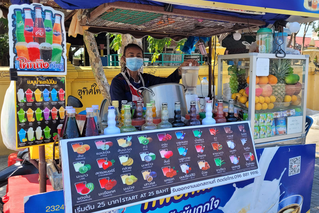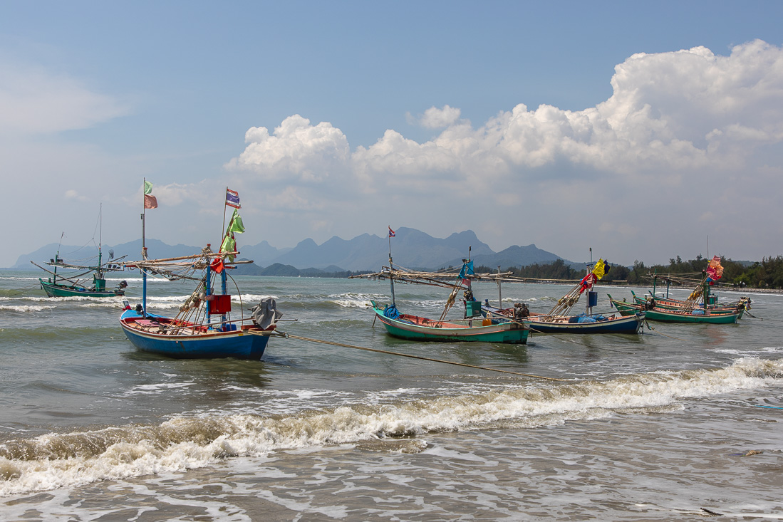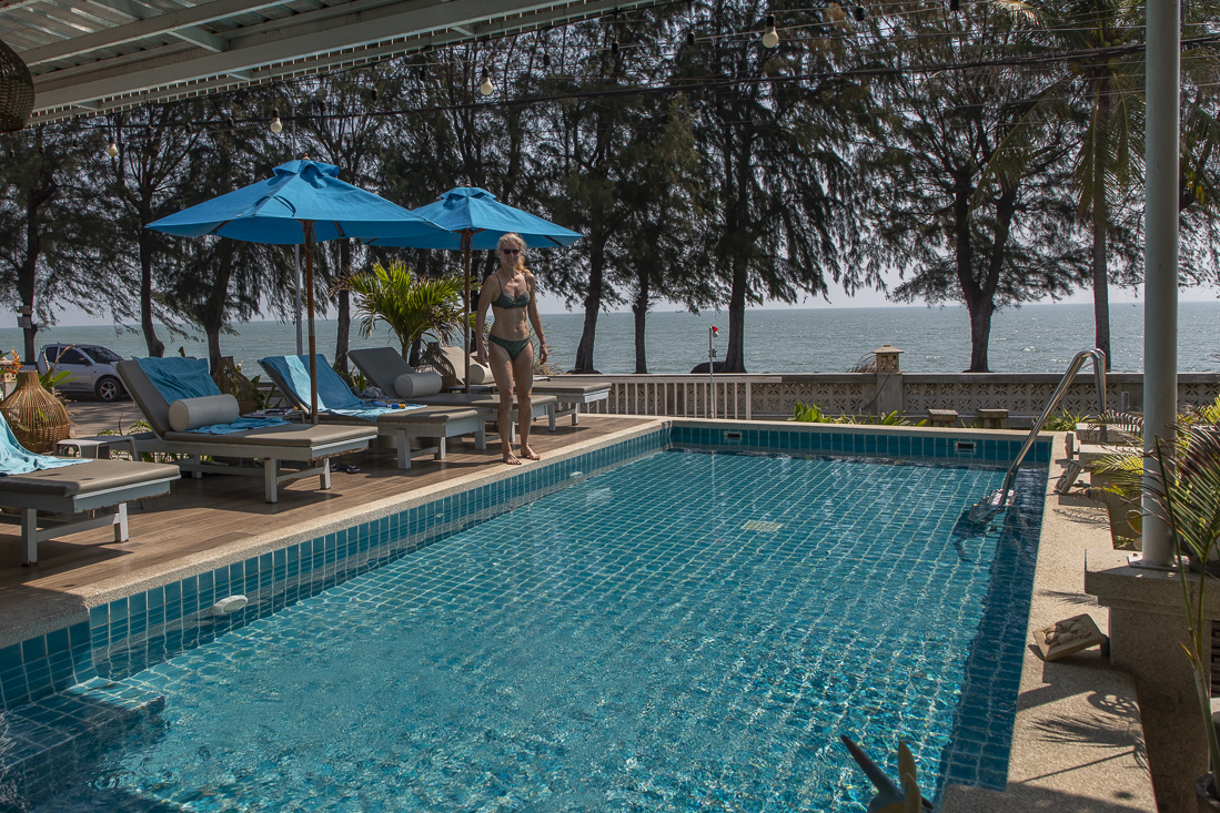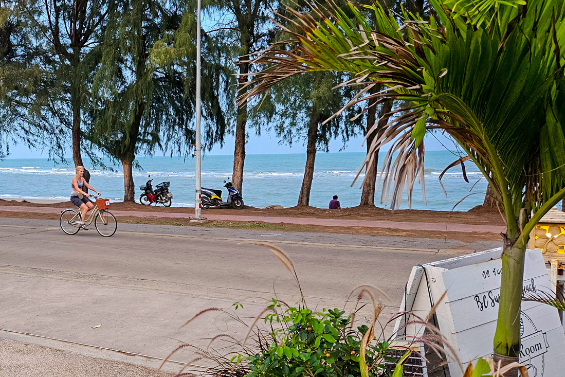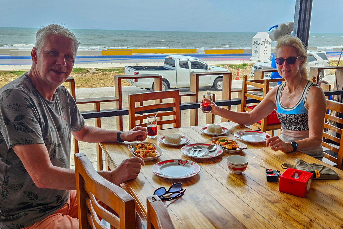 Om precies 7.30u zaten we aan het uitgebreide ontbijt. Iets voor 8 uur namen we afscheid van onze zeer hartelijke hoteleigenaresse en stapten in de taxi naar de busterminal. Er was op deze zondagochtend nagenoeg geen verkeer, dus waren we razendsnel op onze bestemming. Ons loketje Ʃn bus waren snel gevonden. De buschauffeur was een nogal nare man (zachtjes uitgedrukt). Iedereen werd afgesnauwd die niet snel genoeg deed wat de man wilde. Dat zouden vier lange uren worden. Eenmaal in Hua Hin hebben we de koffers aangepakt en zonder gedag te zeggen weggelopen. Wat een bokken..... Een grab was snel gevonden en zo waren we 10 minuutjes later al onderweg naar Pranburi en ons hotel BC Summer Beach was snel gevonden. Na het inchecken kregen we een prachtige kamer aan de zijkant van het hotel. Meteen maar dankbaar gebruik gemaakte van de leenfietsen en snel langs de boulevard gefietst om een lunchadresje te vinden. Bij visrestaurant OX zaten veel Thai te eten, dat zal dus wel goed zijn. Nou dat klopte. Hoogste tijd voor een ligbedje bij het zwembad. 's Avonds naar de avondmarkt gewandeld en ons verbaasd over de Thai, die in grote groepen langs de kustlijn zitten te genieten en samen eten. Daarna bij Sea&Sound (soort streetfoodrestaurant) aangeschoven bij onze Duitse buurtjes Maria und Bernd. Het was een lange dag en het heerlijk zachte bed riep....