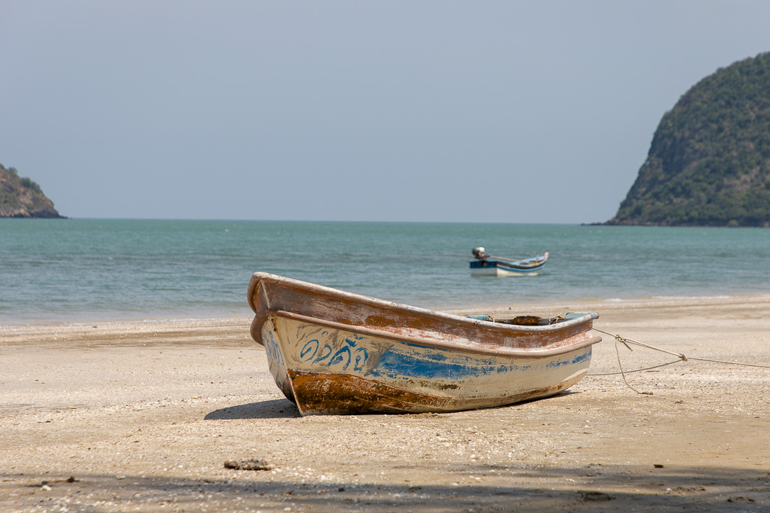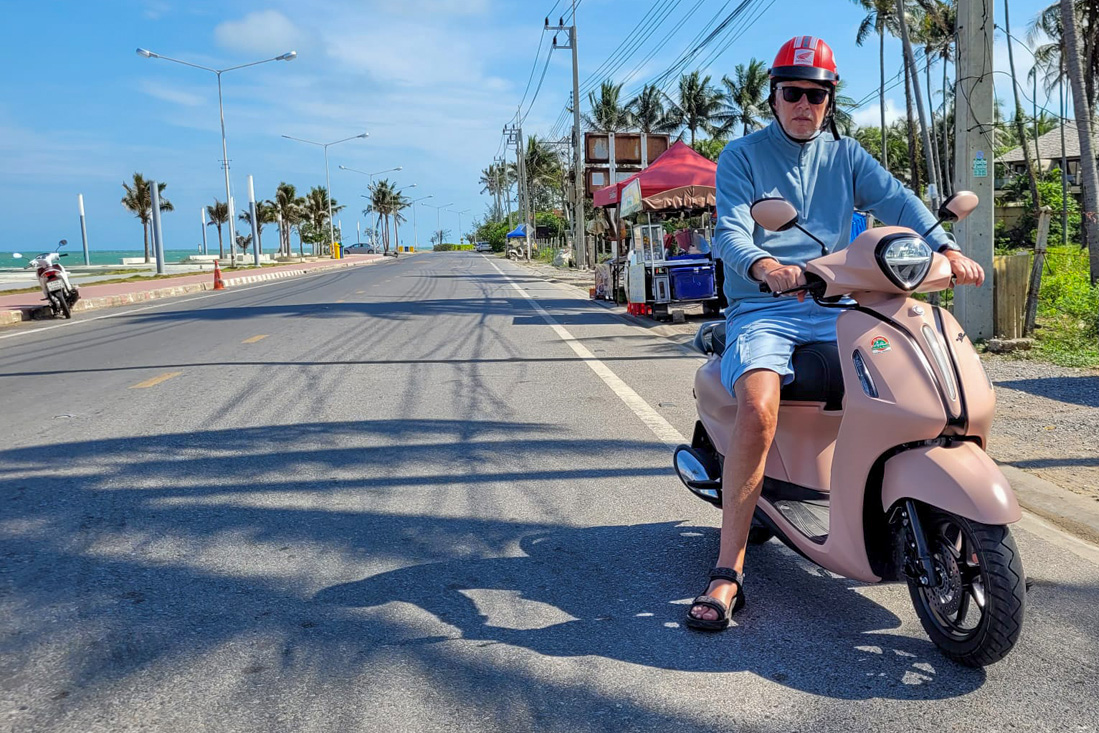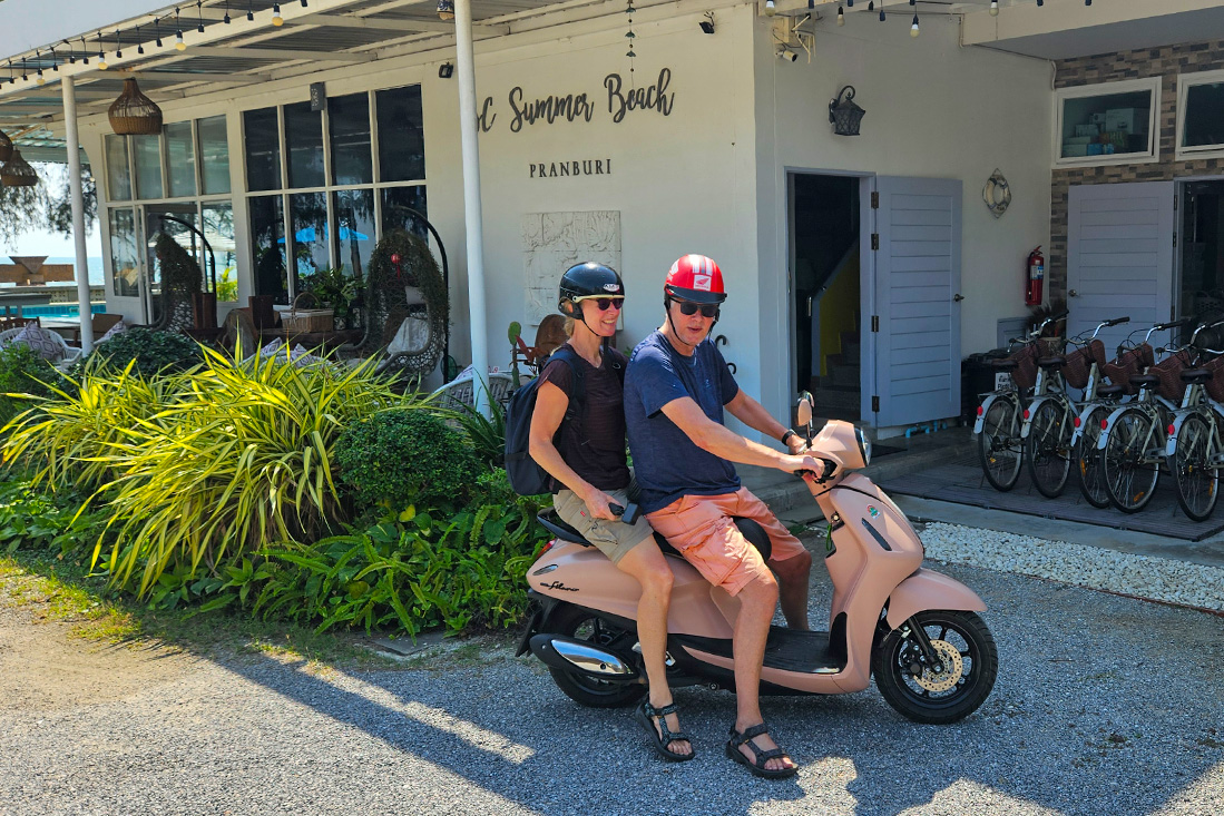 Gisteren aan Ploy gevraagd of er ergens een scooter te huur was in Pranburi. Dit werd door haar razensnel geregeld en vandaag zou onze huurscooter worden afgeleverd. Iets voor 10 uur komt er een zachtroze scooter het terrein oprijden. En ja hoor, deze spiksplinternieuwe motorscooter bleek voor ons te zijn. Na een verplichte rijvaardigheidproef; 2 rondjes op het parkeerterrein was de afleverjongen tevreden. Met onze leenhelmen stapten we een kwartier later op onze zuurstok voor een rit naar de stranden in het zuiden. Snel komt Ploy aanrennen met badhanddoeken en flesjes koud water. Deze vrouw is onbetaalbaar. De 110cc scooter had er zin in, net als wij en zo zoefden we langs de kust naar het zuiden. Natuurlijk veel fotomomentjes, koffie- en lunchstop. Rond 15.00u waren we weer terug bij het hotel. Snel de zee ingedoken en dan bijkomen op een ligbedje.