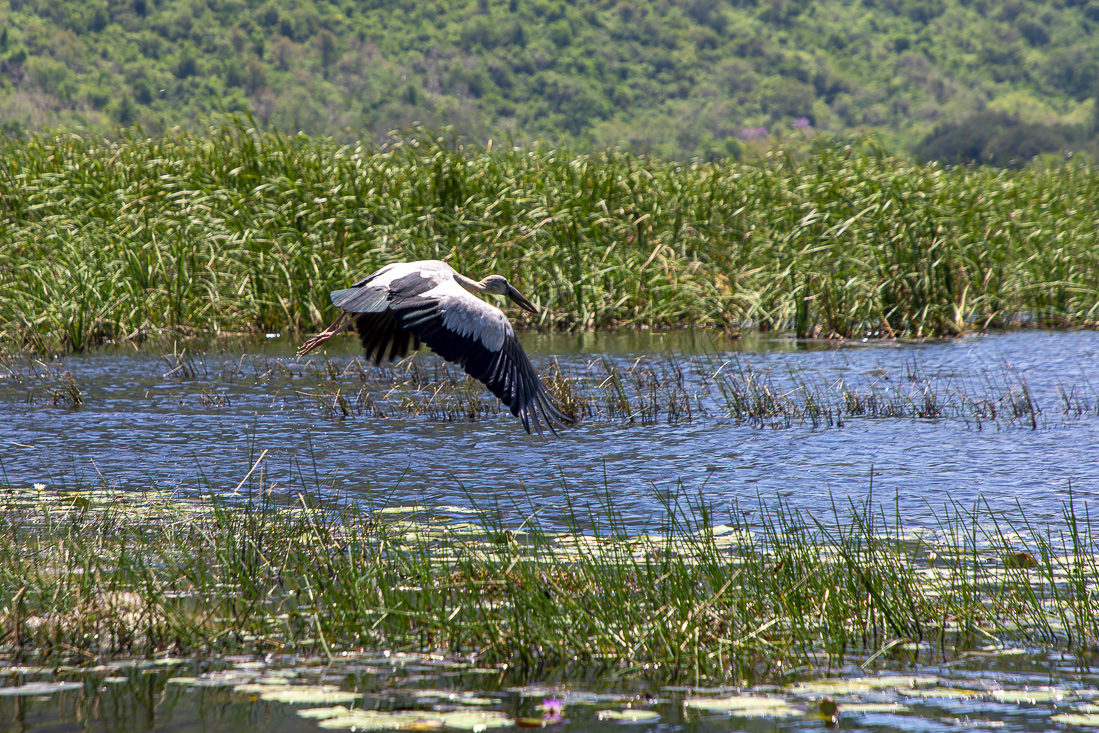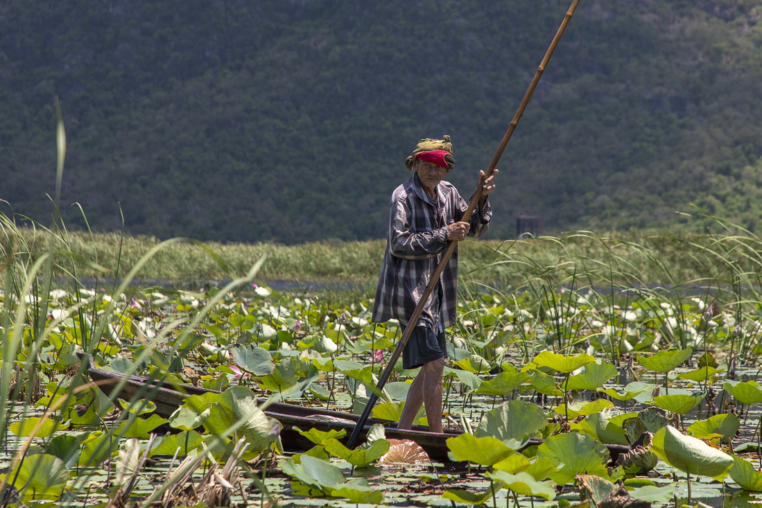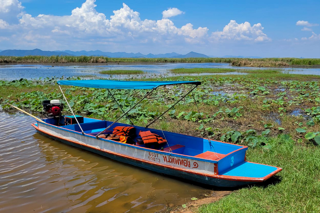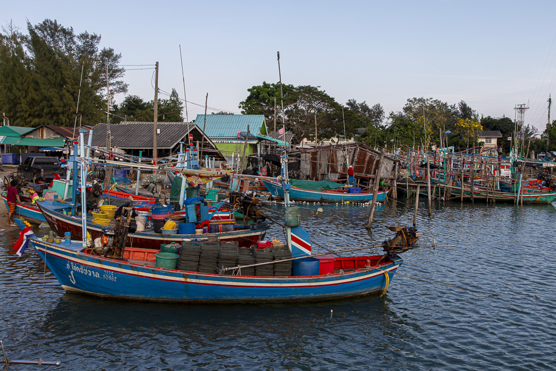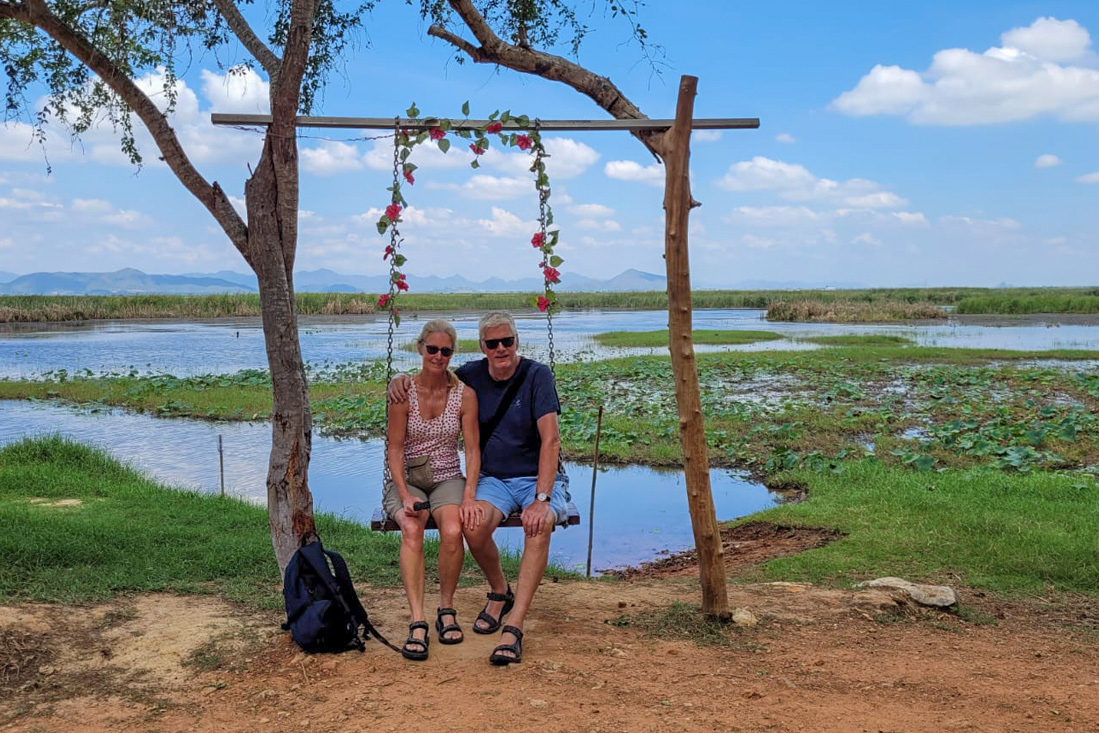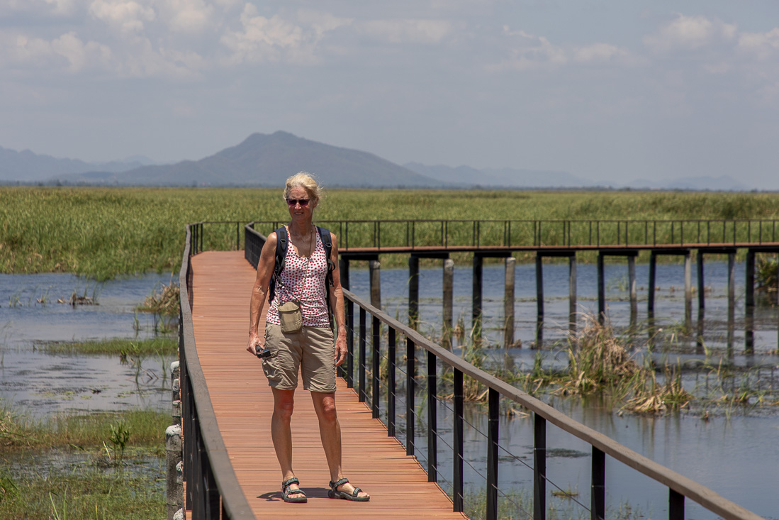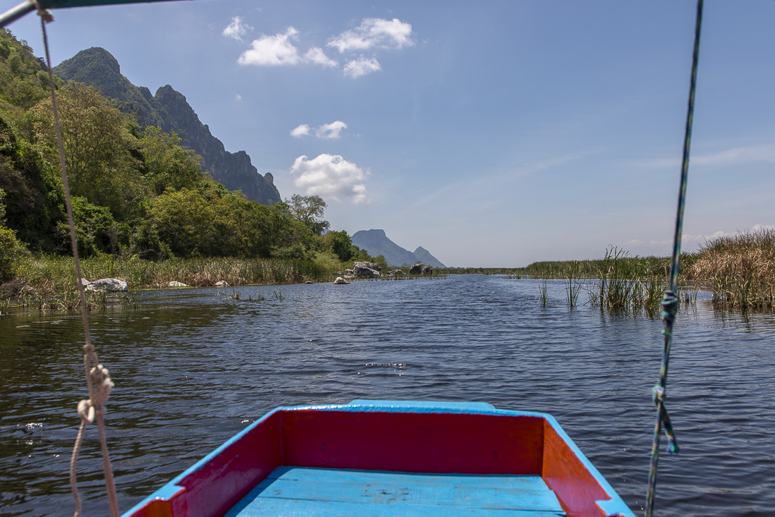 Na het ontbijt bij Ploy geïnformeerd naar een leuk uitstapje met de scooter. Zij adviseerde om een vaartocht(je) te maken in het Nationaal Park Khao Sam Roi Yot. Strak plan. De bewegwijzering in de buurt van het park liet wat te wensen over en we gokten op een weggetje naar rechts. Bij het eerste-de-beste huis gevraagd en ja hoor, goed gegokt. Na 500 M rechts en dan héél lang rechtuit. Daar vonden we een hokje met twee hoogbejaarde dames die het ticketbureau bleken te bemannen. Na het aanschaffen van de kaartjes mochten we ons melden bij de kapitein van een overmaats roeiboot, maar niet voordat we eerst de 'verplichte' schommelfoto hadden laten maken. Met het starten van de buitenboordmotor van onze boot was het meteen gedaan met de stilte in dit mooie gebied. Door een wirwar van vaarweggetjes met ontelbare vogelsoorten kwamen we aan bij de grote opstapplaats. Hier kregen we 20 minuten om de boardwalk op te lopen. Daar bracht de boot ons weer terug. Op de terugweg opnieuw bij restaurant Jim-Dang gestopt voor de lunch. In Pranburi nog maar een keer een massage genomen om de boel weer los te halen.
