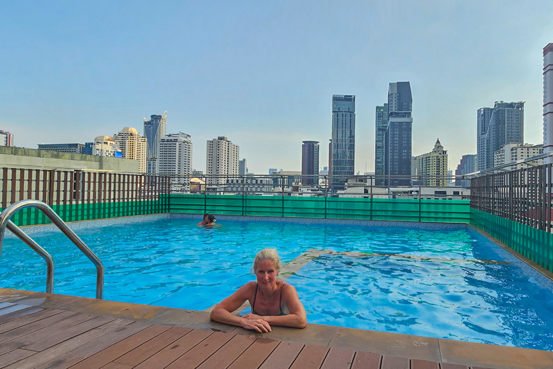 Opnieuw wat vroeger ontbijten, want om 9.00u zou onze taxi komen. Na een zƩƩr hartelijk afscheid van Ploy en de belofte om terug te komen stapten we in de taxibus. Ploy zwaaide ons uit tot we uit het zicht waren. Een klein uurtje later stonden we op de busterminal in Hua Hin. Veel te vroeg natuurlijk. Maar ja, er was genoeg te zien, dus dat uur vloog voorbij. Om 11.00u verlieten we Hua Hin in een zeer luxe touringcar en na een mooie rit kwamen we rond half drie aan bij de luchthaven, om deze met de metro aan de andere kant net zo snel weer te verlaten. Bij het eindstation van de Cityline stapten we uit en na wat zoeken vonden we de juiste straat naar het Top High Airport Link Hotel. Ook hier na het inchecken snel de zwemkleding aangetrokken om een rondje te zwemmen op het dak [wat zijn we blij dat we hier niet twee weken later waren]. Daarna snel de omgeving gaan verkennen en voor de laatste keer genieten van de heerlijke chaos. Midden in de drukte vonden we zowaar een terras waar ze een Changetje van de tap verkochten. 's Avonds niet erg lekker gegeten bij Birmees restaurant YOE YOE LAE. Ach, je kunt niet altijd geluk hebben.