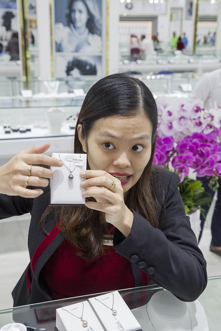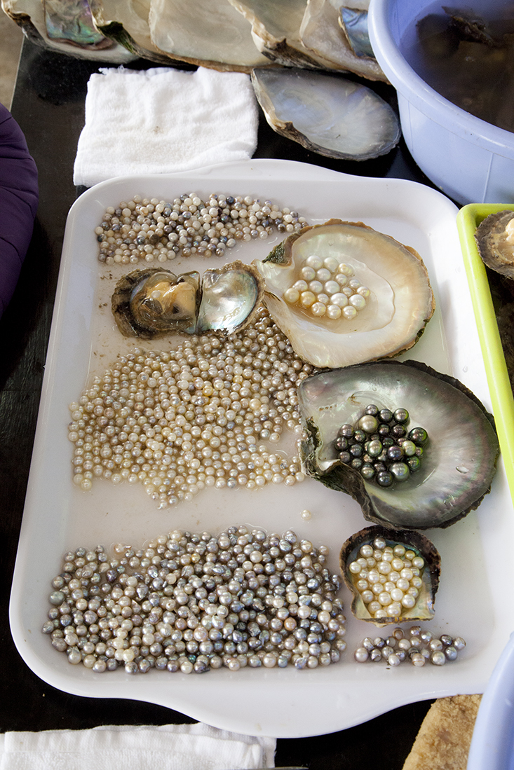 Door Tįŗæt was het rustig op de weg, dus zouden we veel te vroeg in Halong Bay aankomen. Dus gooide Martin nog maar eens een 'verkoopshow' in de strijd. Dit keer moesten we een parelkwekerij bekijken, waar we het plaatsen van het plastic 'knikkertje' in de oester konden zien. Natuurlijk ook een ronde door de enorme shop. Geloof niet dat er iemand van onze groep met een parelketting de deur uit is gegaan.