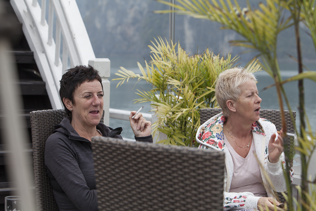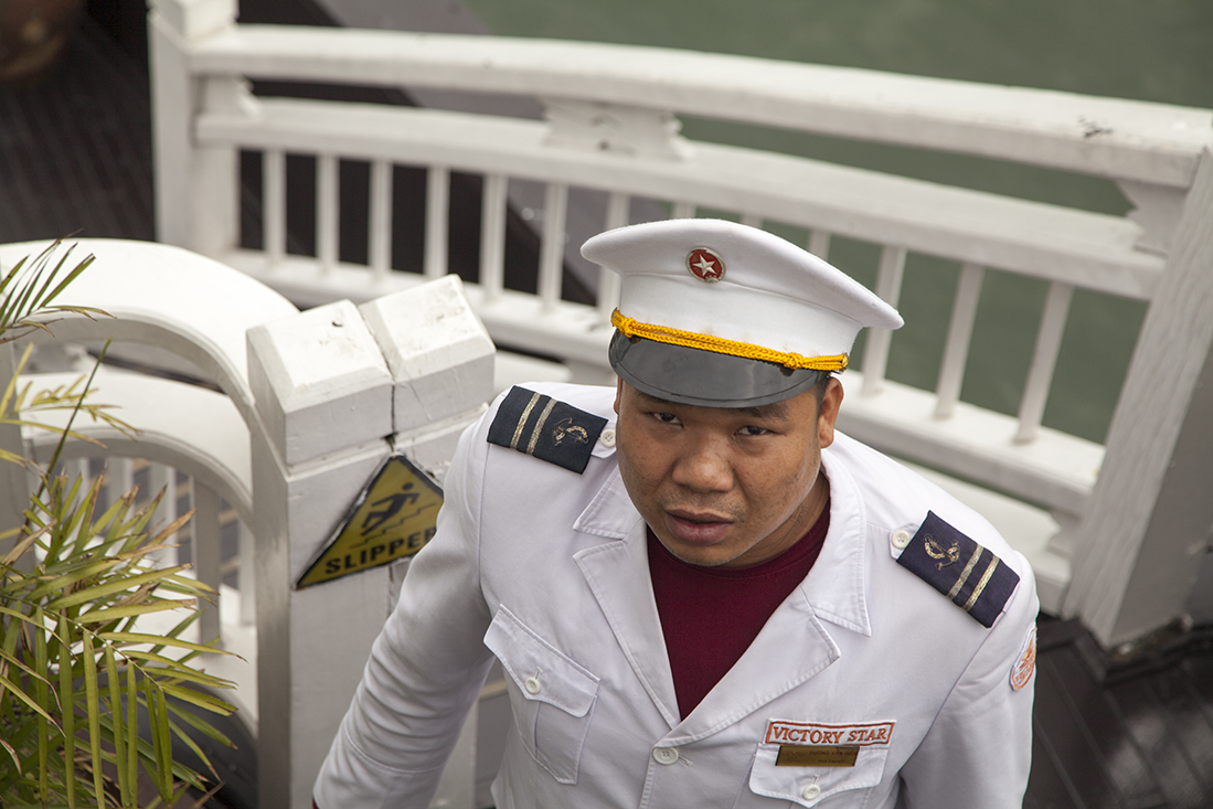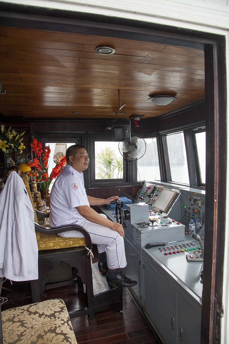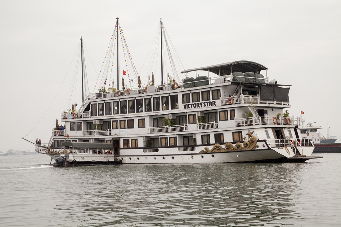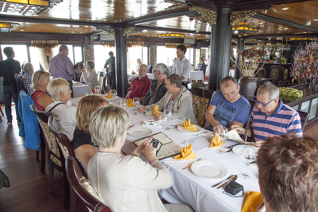 Uiteindelijk belandden we dan toch aan de kade in Halong Bay, een Unesco gebied van 1500 vierkante kilometer met meer dan 2000 spitse kalksteen bergen. Volgens de legende onstaan door een reusachtige draak (ha long betekent neerdalende draak). We gingen met koffers en al aan boord van een tender die ons naar 'onze' boot zou brengen. Martin had ons onderweg al verteld dat we een upgrade hadden naar een 5-sterren schip. Dat deed men wel vaker om niet met een halve bezetting uit te varen. Aangekomen bij de "Victory Star" bleken de 5 sterren zeer goed te kloppen. Dat begon al met de uitstekende lunch. Wat een verwennerij! Op onze sleutel stond 'Suite 2'. Na de lunch bleek dat we (dit keer) eens geluk hadden. Een enorme kamer met balkon en giga badkamer mƩt bubbelbad.