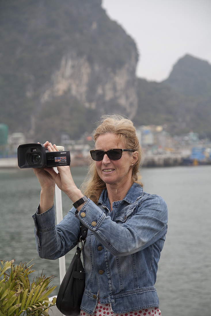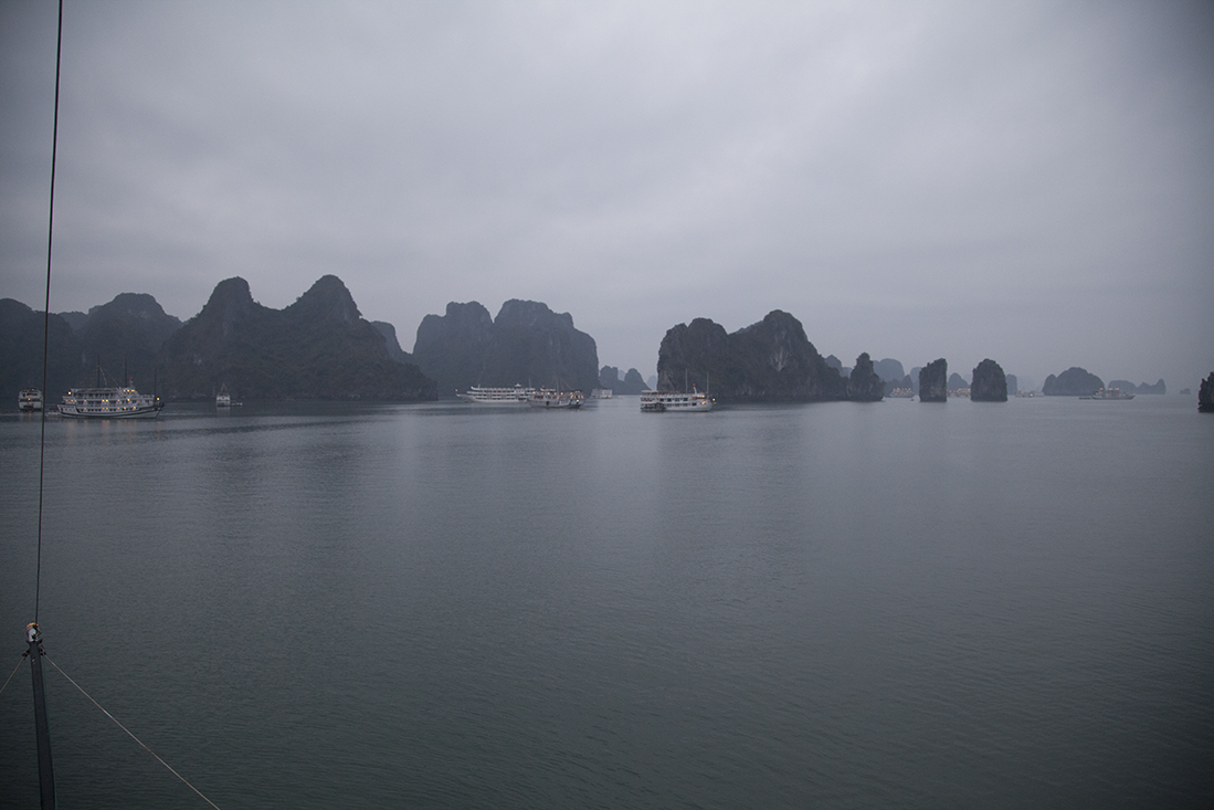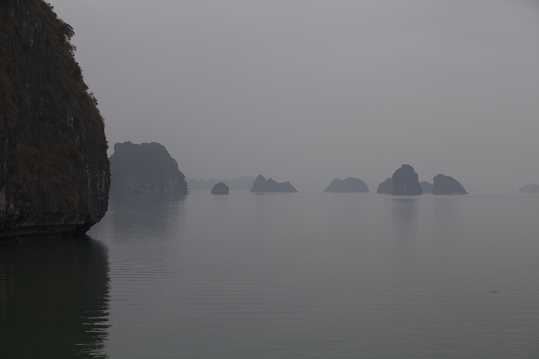 De volgende dag moesten de koffers al extra vroeg buiten de kamer staan. Op de 15e verdieping was het overvol en bijna geen tafel te vinden om te ontbijten. Daarna met de enige kleine lift proberen de benedenverdieping te bereiken, waar de bus alweer voor ons klaarstond. Op naar Halong Bay. Onderweg deed gids Hieu nog eens een poging om wat in 'zijn' engels te vertellen en nam Martin het voorzichtig over, onder het mom: "ik vertaal het even...". GĆŖnant voor alle partijen. Intussen verbaasden we ons over het rijgedrag van de Vietnamezen en ook het vele zwerfvuil langs de wegen. Wat een stelletje viespeuken. Onderweg stopten we bij een 'verkoopshow', waar een stuk of 10 gehandicapten zo'n 10.000 (zelfgemaakte) hardstenen/marmeren beelden en andere kunst verkochten. En wij moesten dat geloven!? Waarschijnlijk gewoon made in China. Maar ja, de koffie smaakte goed.