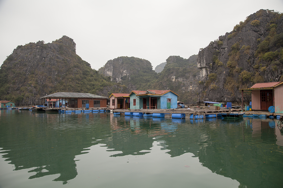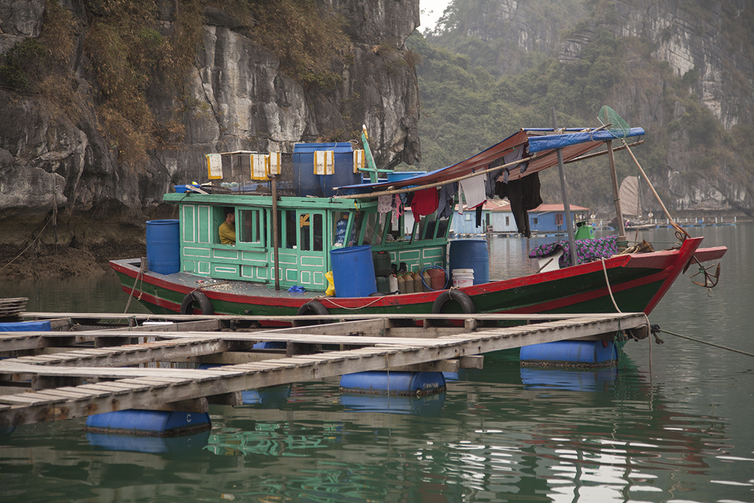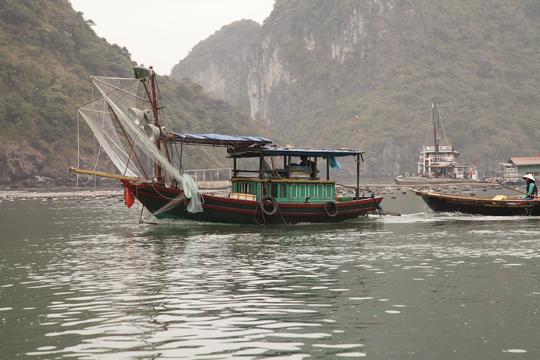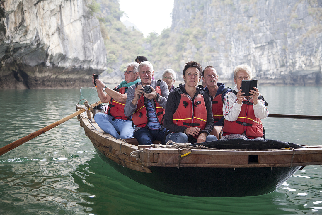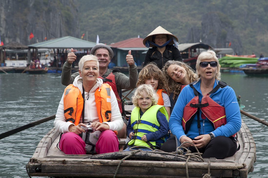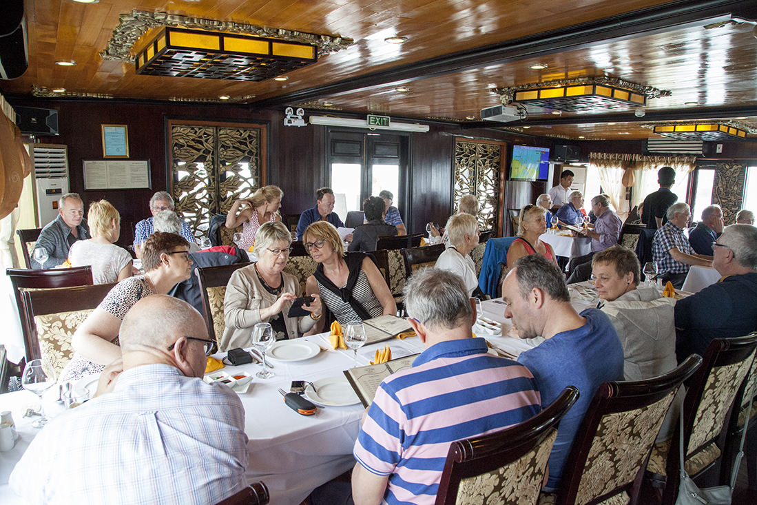 Daarna maar eens aan dek de prachtige omgeving bekijken en kennis gemaakt met Billy Bob, z'n broertje en z'n ouders. De meesten van onze Nederlandse groep en de ongezellige Franstalige Belgen lagen waarschijnlijk te snurken in hun hut. Maar niet voor lang, want al snel moesten we mƩt zwemvest de tender weer in voor een boottochtje met Vietnamese roeier/roeister. Na een prachtige tocht door de drijvende vissersdorpjes werden we weer afgeleverd op de Victory Star. Na het opfrissen mochten we alweer aan tafel voor een fantastisch diner. Bijtijds zocht iedereen daarna z'n hut op.